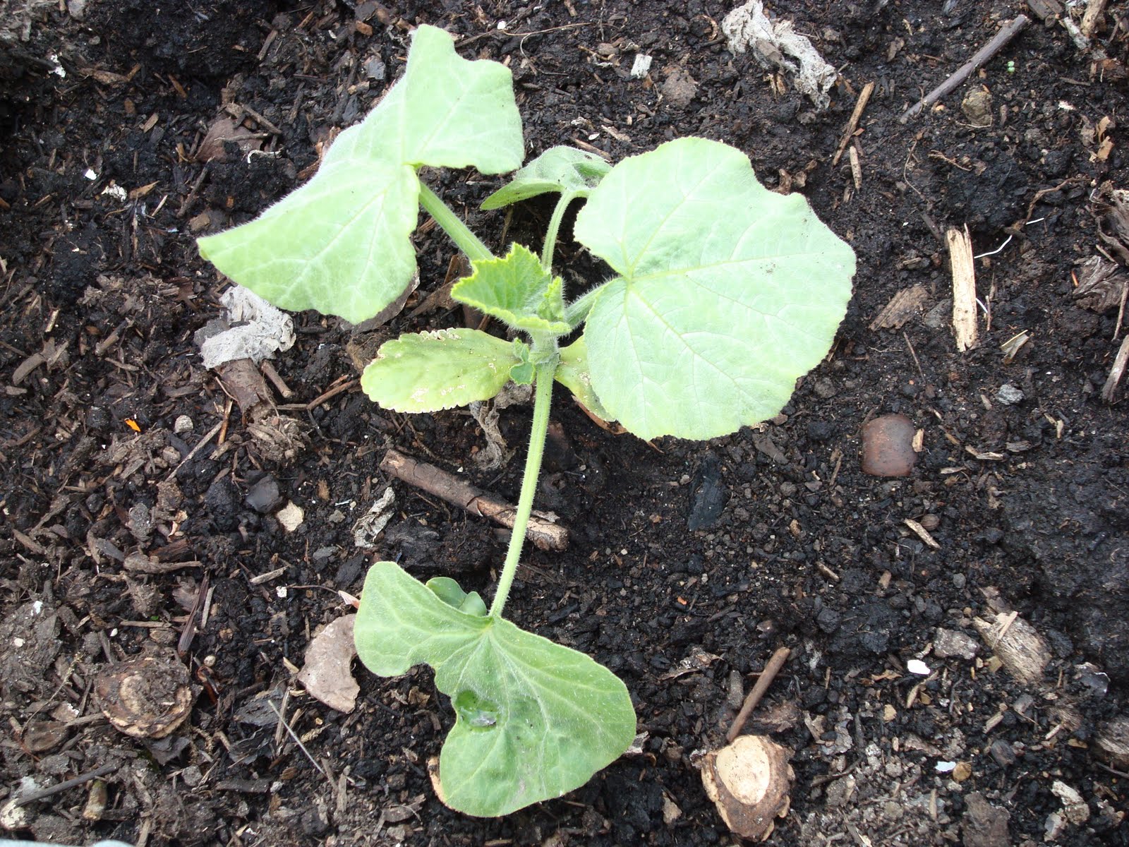 About two weeks later I had seedlings, and a couple of weeks ago I transplanted them into one of the vegetable beds. Two of them I have planted directly into the bed, but the remaining three I have potted up into old teracotta pottery "things".